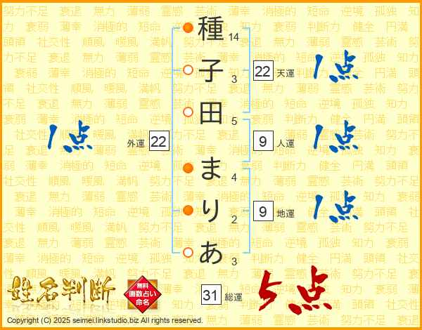 生活面を象徴する運勢です。外部から受ける影響力を表し、結婚運、家庭運や職場、環境への順応性を表します。総運から人運を引いた画数。姓や名が1文字の場合を除く。