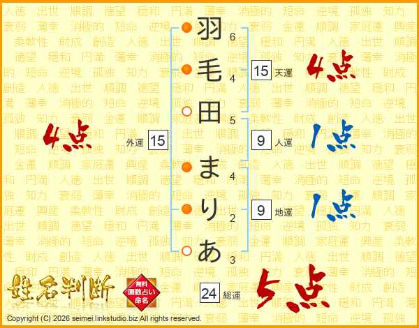 生活面を象徴する運勢です。外部から受ける影響力を表し、結婚運、家庭運や職場、環境への順応性を表します。総運から人運を引いた画数。姓や名が1文字の場合を除く。