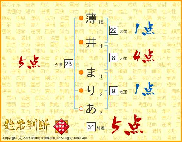 薄井まりあさんの総運は31画の5点!