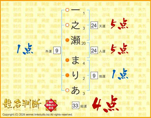 一之瀬まりあさんの総運は33画の4点!