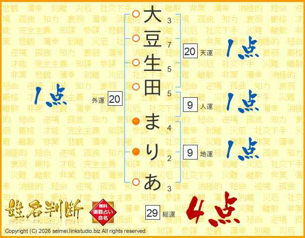 大(3画)豆(7画)生(5画)田(5画) ま(4画)り(2画)あ(3画)