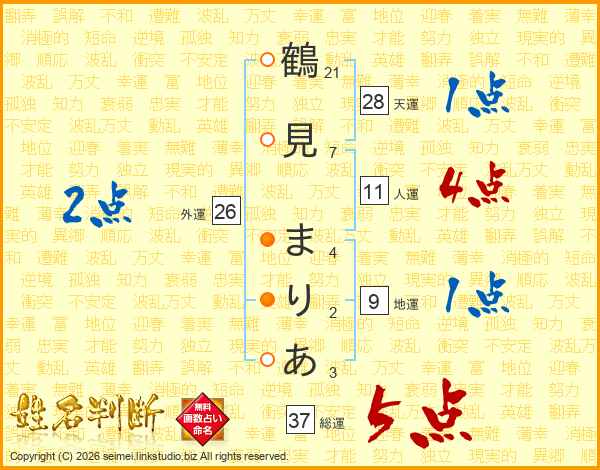 鶴(21画)見(7画) ま(4画)り(2画)あ(3画)