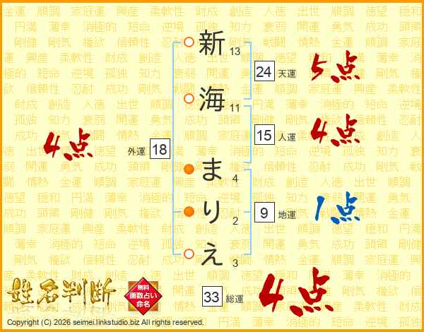 新海まりえさんの総運は33画の4点!