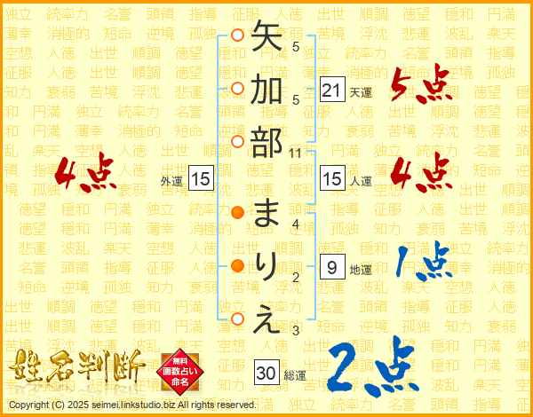 矢加部まりえさんの天運は21画の5点!