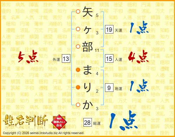 矢ヶ部まりかさんの外運は13画の5点!