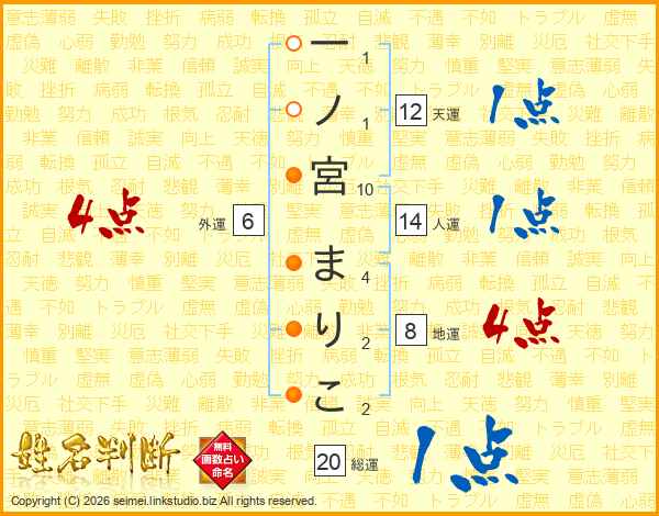一ノ宮まりこさんの人運は14画の1点!