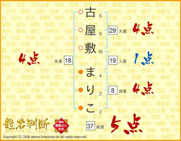 古(5画)屋(9画)敷(15画) ま(4画)り(2画)こ(2画)