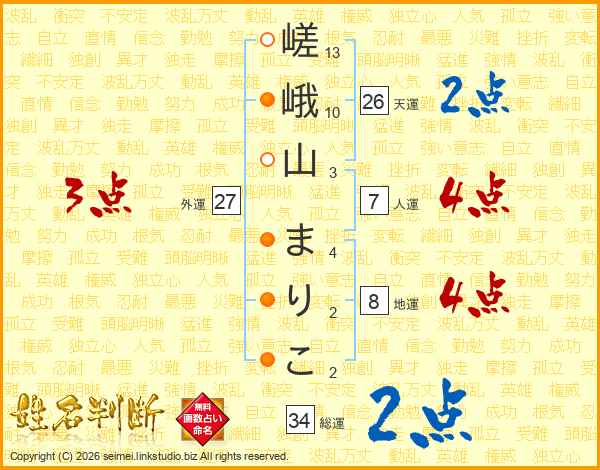 生活面を象徴する運勢です。外部から受ける影響力を表し、結婚運、家庭運や職場、環境への順応性を表します。総運から人運を引いた画数。姓や名が1文字の場合を除く。