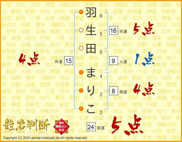羽(6画)生(5画)田(5画) ま(4画)り(2画)こ(2画)