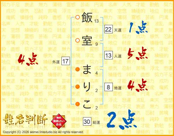 飯室まりこさんの人運は13画の5点!