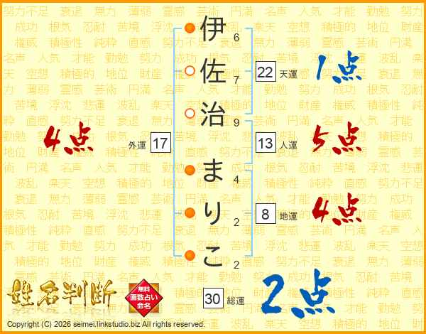 伊佐治まりこさんの人運は13画の5点!