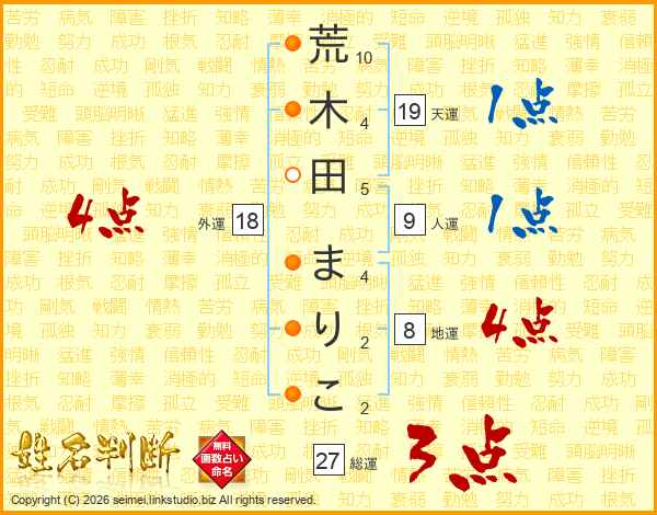 荒(10画)木(4画)田(5画) ま(4画)り(2画)こ(2画)
