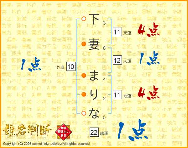 下(3画)妻(8画) ま(4画)り(2画)な(5画)