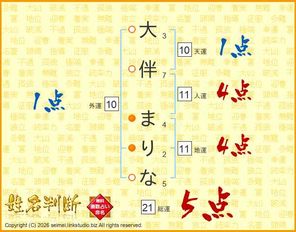 あなたの人生を表す1番重要な運勢です。生涯を通じて影響する総合運となり、主に50歳以降の晩年期に影響を及ぼします。苗字と名前の合計画数。