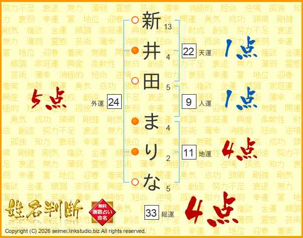 新井田まりなさんの総運は33画の4点!
