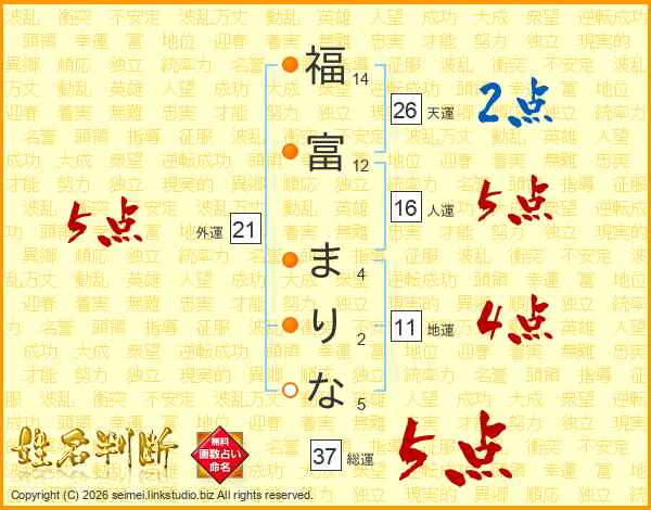 福(14画)富(12画) ま(4画)り(2画)な(5画)