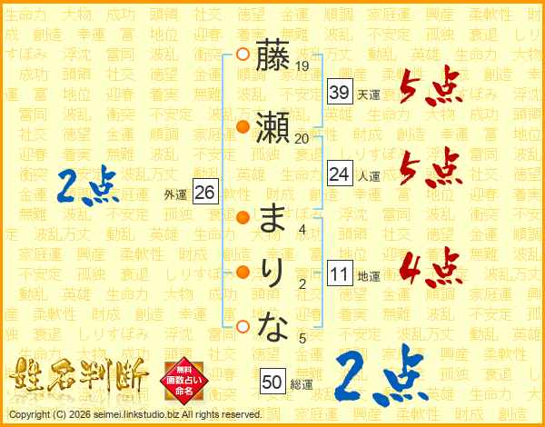 藤瀬まりなさんの天運は39画の5点!