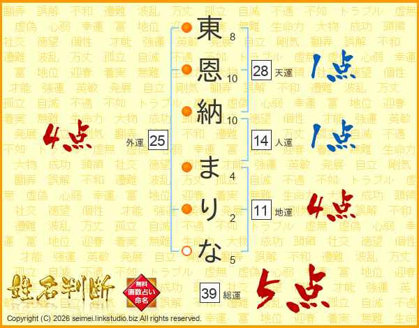 東恩納まりなさんの総運は39画の5点!
