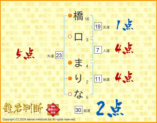 あなたの人生を表す1番重要な運勢です。生涯を通じて影響する総合運となり、主に50歳以降の晩年期に影響を及ぼします。苗字と名前の合計画数。