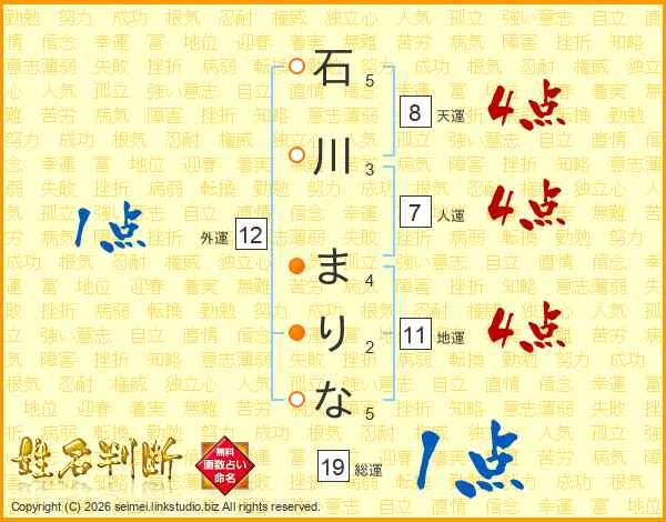 生活面を象徴する運勢です。外部から受ける影響力を表し、結婚運、家庭運や職場、環境への順応性を表します。総運から人運を引いた画数。姓や名が1文字の場合を除く。