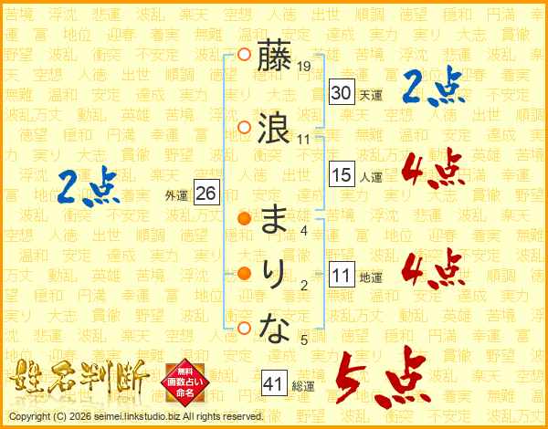 藤浪まりなさんの総運は41画の5点!