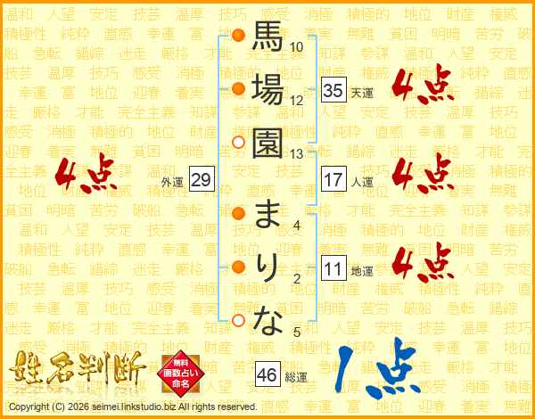 生活面を象徴する運勢です。外部から受ける影響力を表し、結婚運、家庭運や職場、環境への順応性を表します。総運から人運を引いた画数。姓や名が1文字の場合を除く。