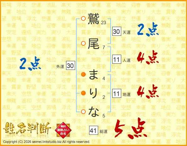 鷲(23画)尾(7画) ま(4画)り(2画)な(5画)