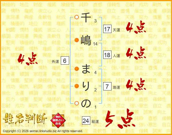 千(3画)嶋(14画) ま(4画)り(2画)の(1画)