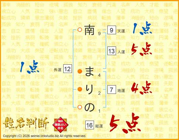 生活面を象徴する運勢です。外部から受ける影響力を表し、結婚運、家庭運や職場、環境への順応性を表します。総運から人運を引いた画数。姓や名が1文字の場合を除く。