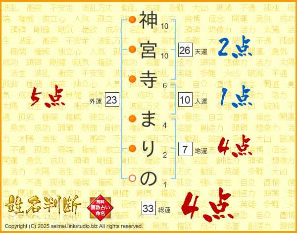 生活面を象徴する運勢です。外部から受ける影響力を表し、結婚運、家庭運や職場、環境への順応性を表します。総運から人運を引いた画数。姓や名が1文字の場合を除く。