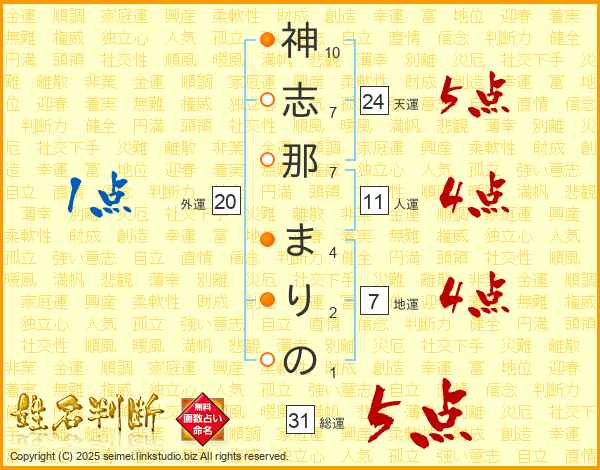 神(10画)志(7画)那(7画) ま(4画)り(2画)の(1画)
