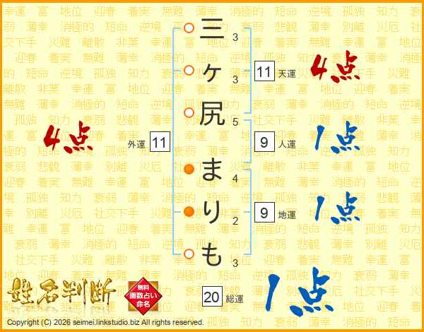 生活面を象徴する運勢です。外部から受ける影響力を表し、結婚運、家庭運や職場、環境への順応性を表します。総運から人運を引いた画数。姓や名が1文字の場合を除く。
