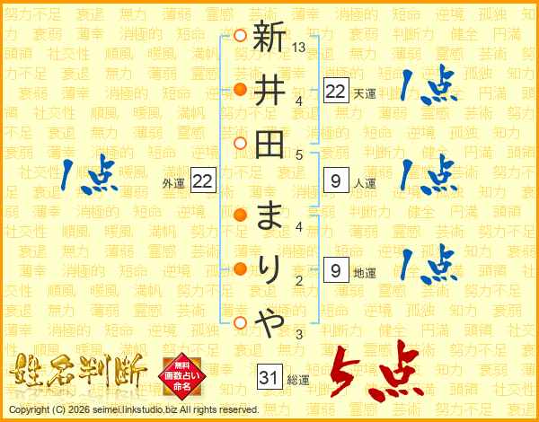 新(13画)井(4画)田(5画) ま(4画)り(2画)や(3画)