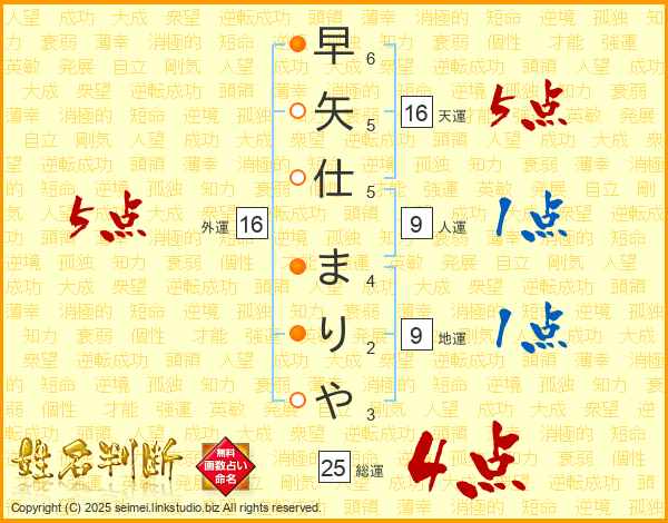 生活面を象徴する運勢です。外部から受ける影響力を表し、結婚運、家庭運や職場、環境への順応性を表します。総運から人運を引いた画数。姓や名が1文字の場合を除く。