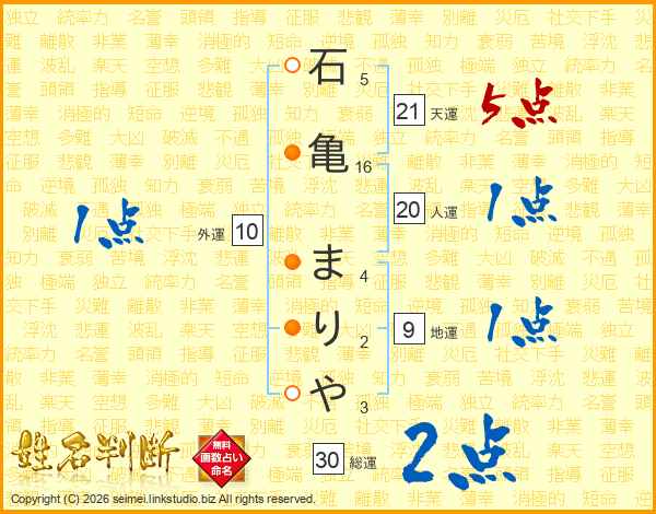 石亀まりやさんの天運は21画の5点!