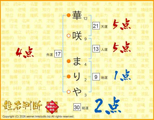 華(12画)咲(9画) ま(4画)り(2画)や(3画)