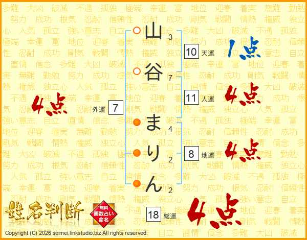 生活面を象徴する運勢です。外部から受ける影響力を表し、結婚運、家庭運や職場、環境への順応性を表します。総運から人運を引いた画数。姓や名が1文字の場合を除く。