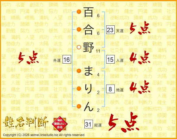 百合野まりんさんの総運は31画の5点!