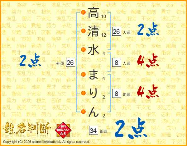 高(10画)清(12画)水(4画) ま(4画)り(2画)ん(2画)