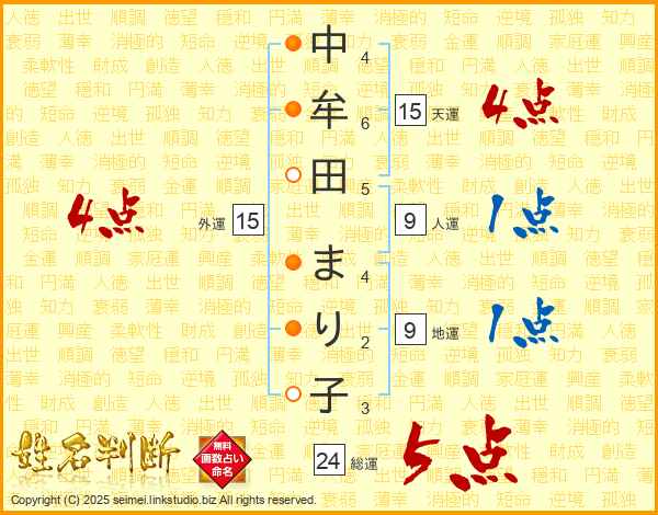 中(4画)牟(6画)田(5画) ま(4画)り(2画)子(3画)