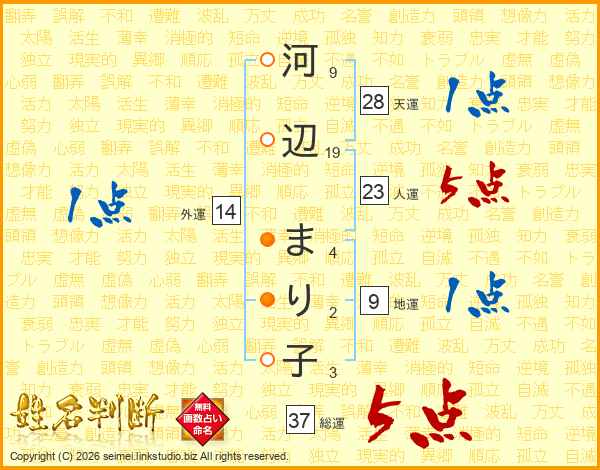 河(9画)辺(19画) ま(4画)り(2画)子(3画)