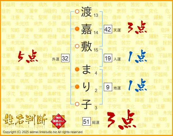 渡(13画)嘉(14画)敷(15画) ま(4画)り(2画)子(3画)