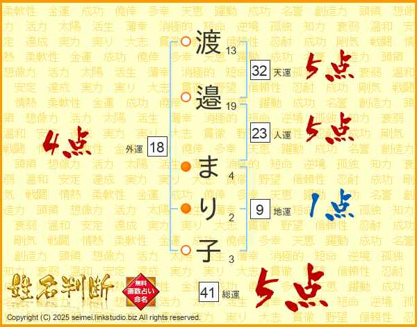 渡(13画)邉(19画) ま(4画)り(2画)子(3画)