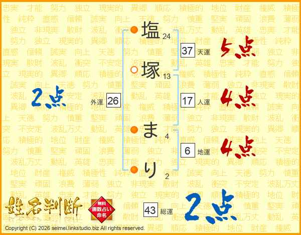 生活面を象徴する運勢です。外部から受ける影響力を表し、結婚運、家庭運や職場、環境への順応性を表します。総運から人運を引いた画数。姓や名が1文字の場合を除く。