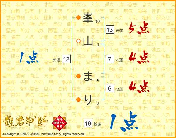 生活面を象徴する運勢です。外部から受ける影響力を表し、結婚運、家庭運や職場、環境への順応性を表します。総運から人運を引いた画数。姓や名が1文字の場合を除く。