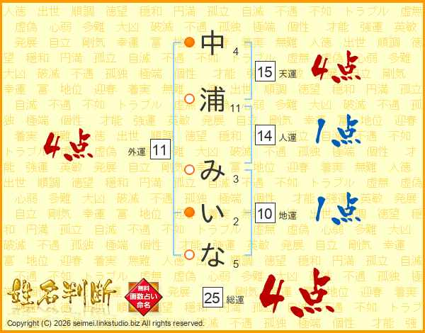 生活面を象徴する運勢です。外部から受ける影響力を表し、結婚運、家庭運や職場、環境への順応性を表します。総運から人運を引いた画数。姓や名が1文字の場合を除く。