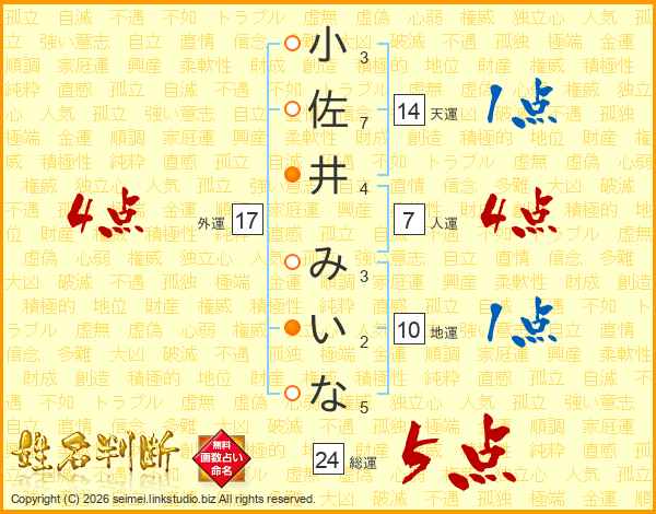 小(3画)佐(7画)井(4画) み(3画)い(2画)な(5画)