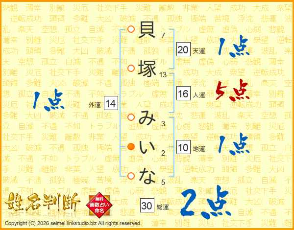 貝(7画)塚(13画) み(3画)い(2画)な(5画)