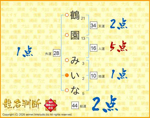 鶴(21画)園(13画) み(3画)い(2画)な(5画)