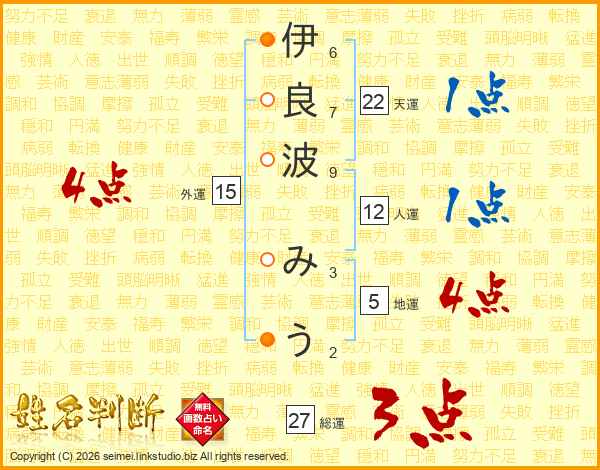 伊(6画)良(7画)波(9画) み(3画)う(2画)